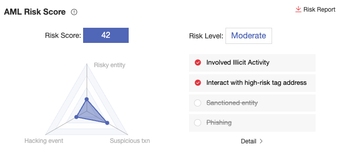 If an investor’s address risk score triggers Keyblock’s risk control requirements — such as when the address is highly associated with illicit activities (e.g., hacking, mixers, darknet fund sources) — Keyblock will suspend the investor’s fund injection. This prevents high-risk assets from entering the fund pool and ensures the filing of an STR (Suspicious Transaction Report).