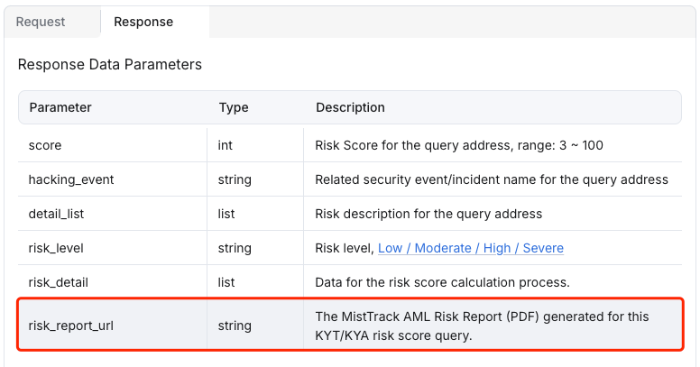 Risk Report Function: Risk reports generated by MistTrack can be accessed via the web-based Dashboard or KYT API. These reports are used for compliance archiving and STR submission.