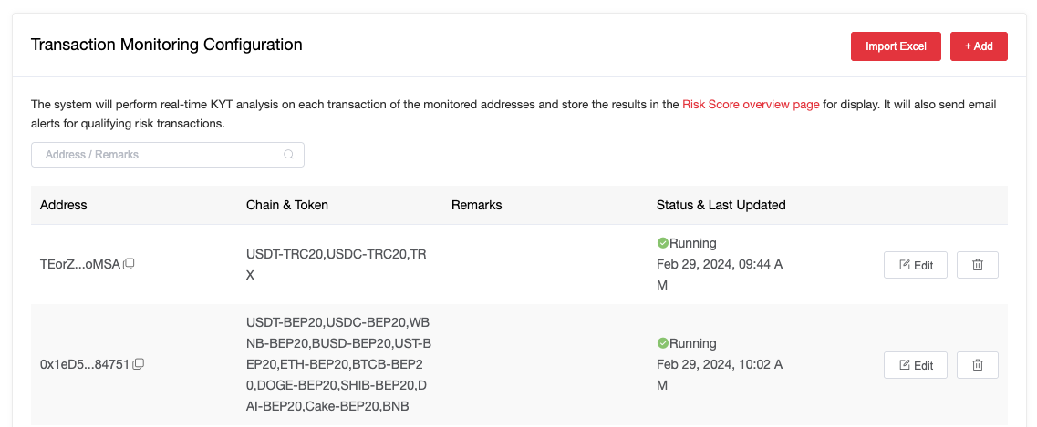 Transaction Risk Monitoring Function: MistTrack enables real-time KYT analysis of monitored addresses and issues alert notifications for risk-related transactions that meet predefined conditions. In addition, each KYT analysis result is stored and displayed on the Risk Score Overview page.