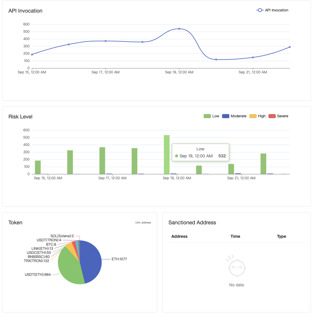 Risk Score Overview Function: This feature displays real-time KYT analysis records from the transaction risk monitoring module, along with the call history of the OpenAPI Risk Score interface. Users can grasp the overall risk distribution from a macro perspective while also conducting in-depth analysis of individual transactions at a micro level — achieving both comprehensiveness and traceability in risk management.