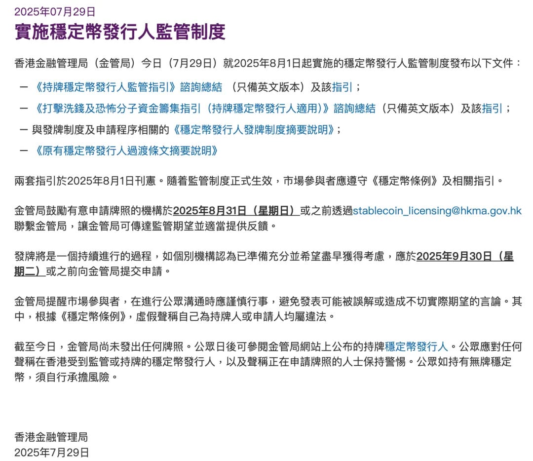 On July 29, 2025, the Hong Kong Monetary Authority (HKMA) issued multiple guidance and explanatory documents regarding the regulatory regime for stablecoin issuers, which officially takes effect on August 1, 2025. Among them, two sets of guidance were gazetted on August 1, 2025: