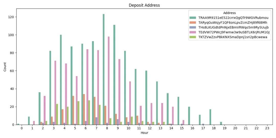 Deposit activity was concentrated between 03:00 and 10:00 UTC, overlapping partially with withdrawal activity. Some addresses, such as TRAA9R9151eE522crrxQgQTr9WGVRubmou and TEdVW72PWcJ9Fwmw3w9uSBTLK6rjRUM1GJ, showed consistent deposit behavior during 03:00–09:00 UTC.