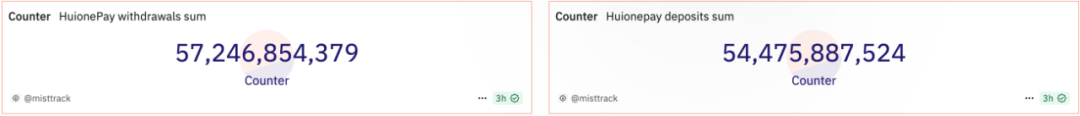Both deposit and withdrawal amounts exceed 50 billion USDT, indicating that HuionePay has been handling substantial fund inflows and outflows over the past 18 months. The total withdrawn value surpasses deposits by 2.771 billion USDT, revealing a clear trend of net capital outflow.
