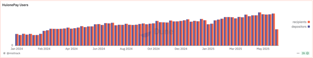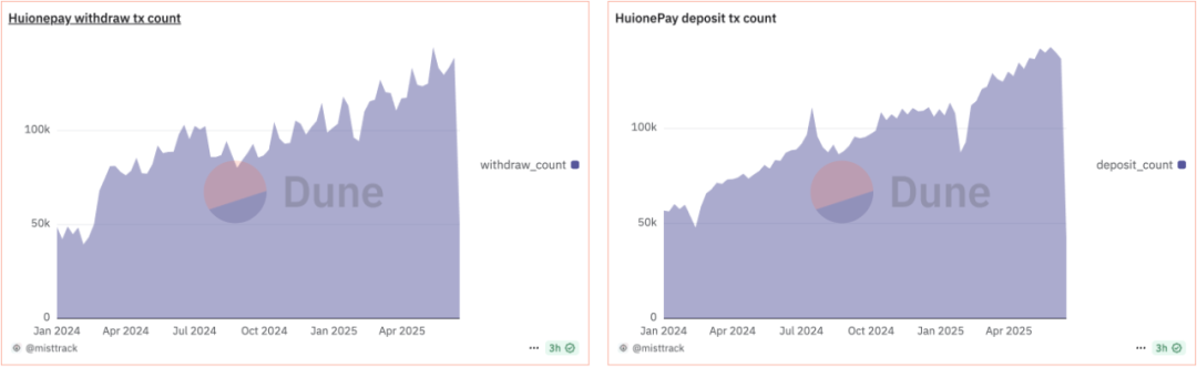 Since early 2024, the number of active deposit addresses on TRON linked to HuionePay has grown from under 30,000 to over 80,000, showing a steady upward trend. It’s important to note that deposit address data is deduplicated and can be considered a rough proxy for user count. Withdrawal addresses, however, may reflect user-specified recipient wallets and thus do not directly indicate unique users.