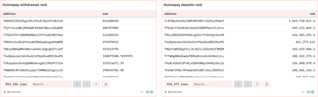 Using the MistTrack AML tool, we found HuionePay’s withdrawals exhibit a certain degree of capital concentration. The top three withdrawal addresses are: