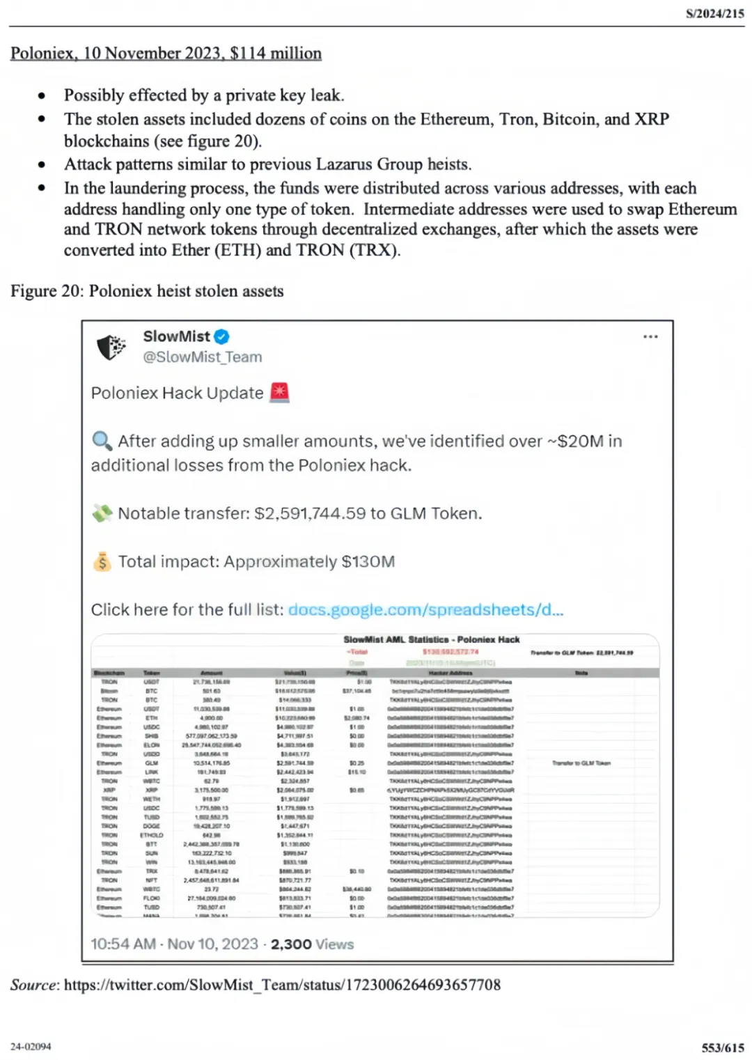 Additionally, on page 553, the report cites the SlowMist AML team’s analysis of the hacking incident at the Poloniex exchange on November 10, 2023, which resulted in losses of approximately $130 million. The rapid and professional manner of the attack led our AML team to suspect it was a typical APT (Advanced Persistent Threat) attack, likely carried out by the North Korean hacker organization Lazarus Group. Following the incident, our team promptly intervened to analyze and quantify the total losses, involved tokens, hacker addresses, and shared their findings in a timely manner.