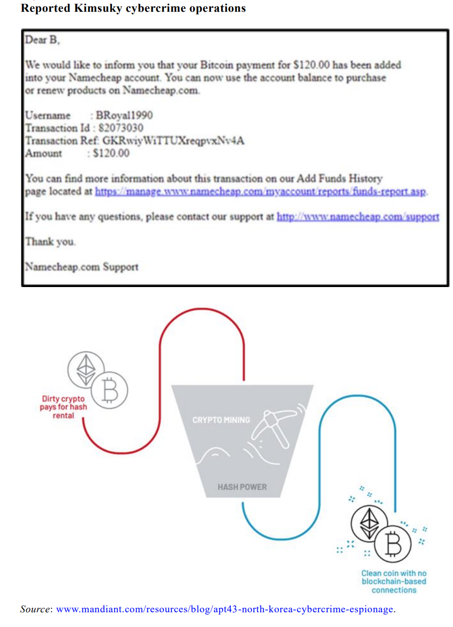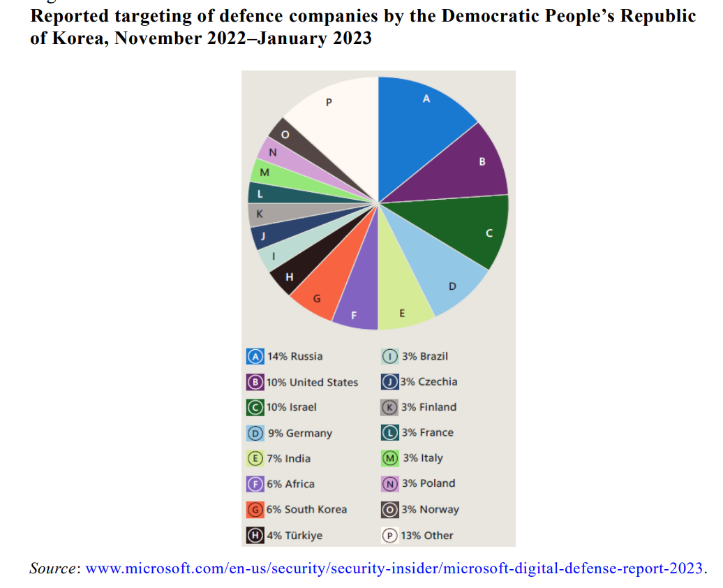 3. The Panel continues to investigate entities and individuals involved in banned exports, including companies suspected of selling North Korean-made equipment, such as Global Communications; companies allegedly connected to networks that facilitate arms trades between the DPRK and the Russian Federation, such as Versor S.R.O.; and several cases of weapon trades involving North Korea and other countries. North Korea’s Reconnaissance General Bureau and its affiliated cyber threat actors (Kimsuky, Lazarus Group, Andariel, and BlueNoroff) persist in conducting cyber attacks primarily aimed at stealing valuable information and generating illegal revenue.
