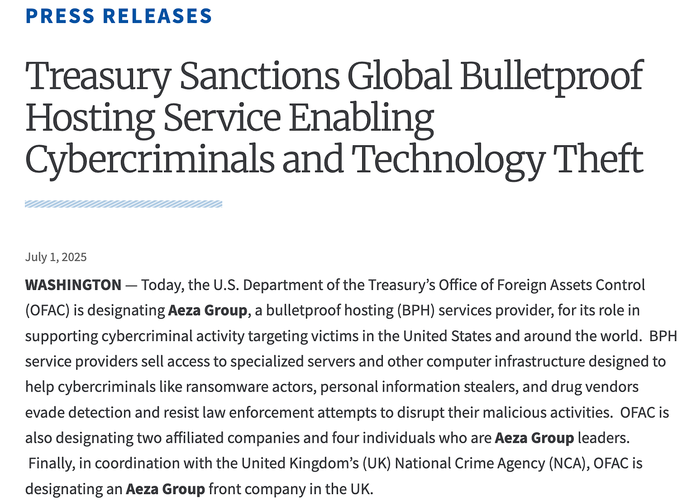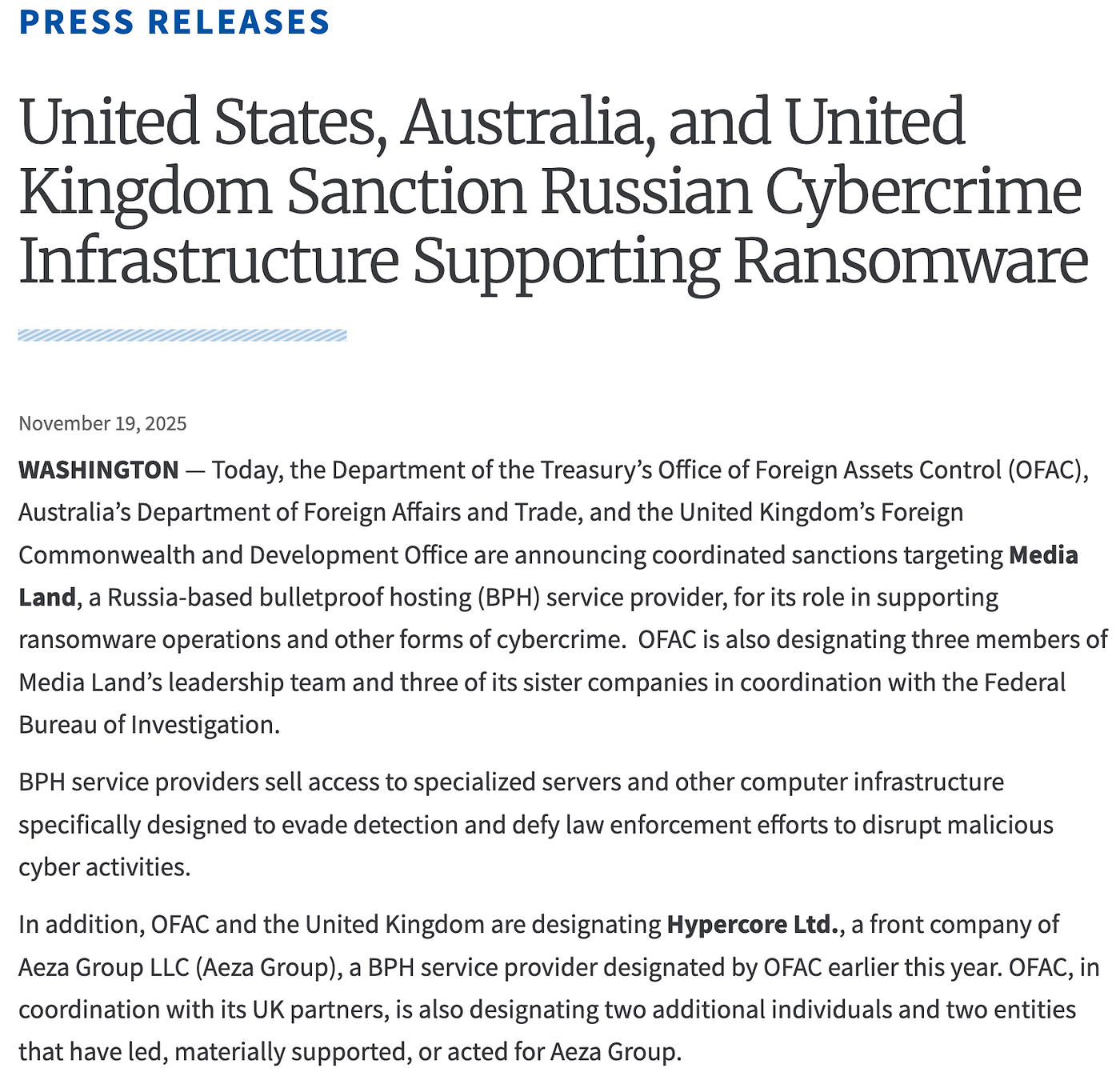 On November 19, 2025, the U.S. Department of the Treasury’s Office of Foreign Assets Control (OFAC), Australia’s Department of Foreign Affairs and Trade (DFAT), and the United Kingdom’s Foreign, Commonwealth & Development Office (FCDO) jointly announced a new round of sanctions against multiple Russia-based bulletproof hosting (BPH) providers and associated individuals, citing their support for cybercrime activities, including ransomware operations. The primary targets of this action include key leaders and affiliated entities of Media Land, as well as core members of Aeza Group and related shell companies.