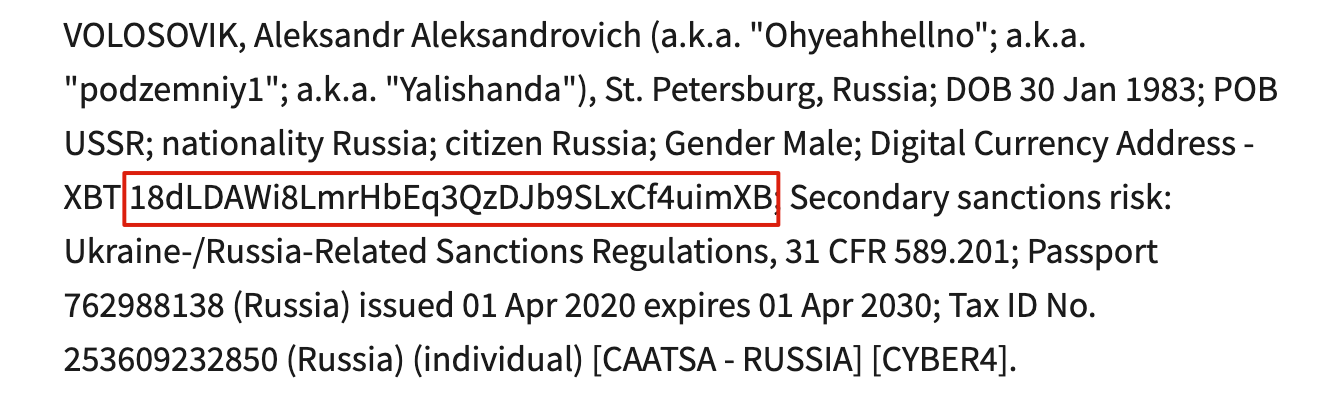 As part of this sanctions action, a Bitcoin address directly controlled by Aleksandr Volosovik has also been added to the OFAC sanctions list: