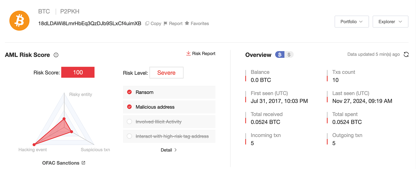 According to MistTrack, the anti–money laundering tracking and analysis system developed by SlowMist, the Bitcoin address has remained active from August 2017 to November 2024, during which it received a total of five incoming transactions amounting to 0.0524 BTC.